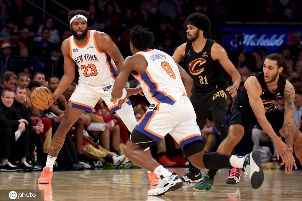 尼克斯队首发:杰伦-布伦森、米卡尔-布里奇斯、OG-阿奴诺比、米切尔-罗宾逊、约什-哈特