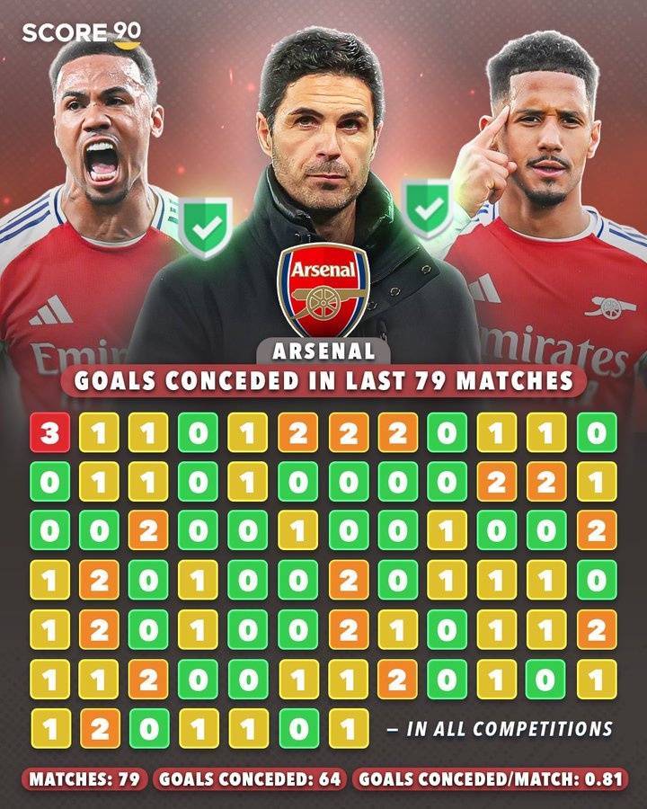 在过去79场比赛中,阿森纳一共丢了64球,场均丢0.81球。