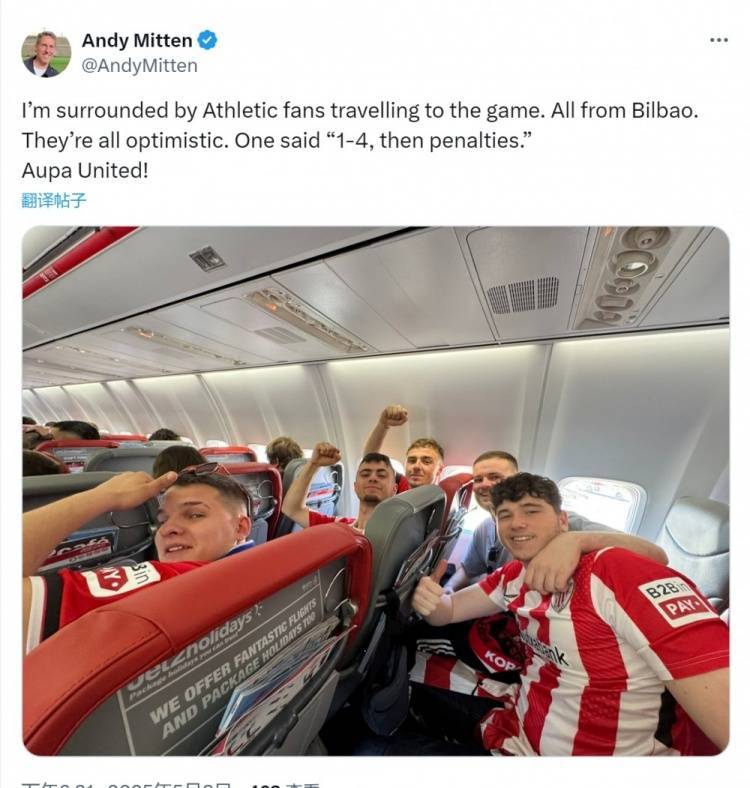 曼联跟队记者Andy Mitten在社交媒体上晒出与毕尔巴鄂球迷的合照,并写道:“我周围都是来看比赛的毕尔巴鄂球迷,他们都很乐观,其中一名球迷说——(毕尔巴鄂)4-1,然后点球决战。”