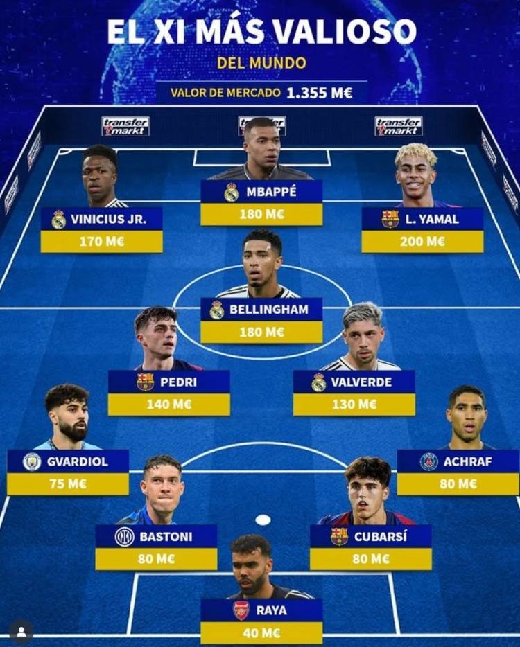 直播吧7月5日讯 《转会市场》统计了当前足坛身价最贵阵容,皇马和巴萨共计占据7席。