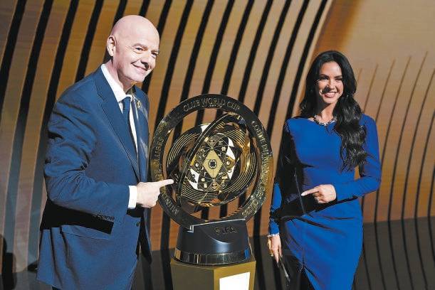 去年12月,国际足联主席因凡蒂诺在世俱杯抽签仪式上与世俱杯冠军奖杯合影。 新华社发